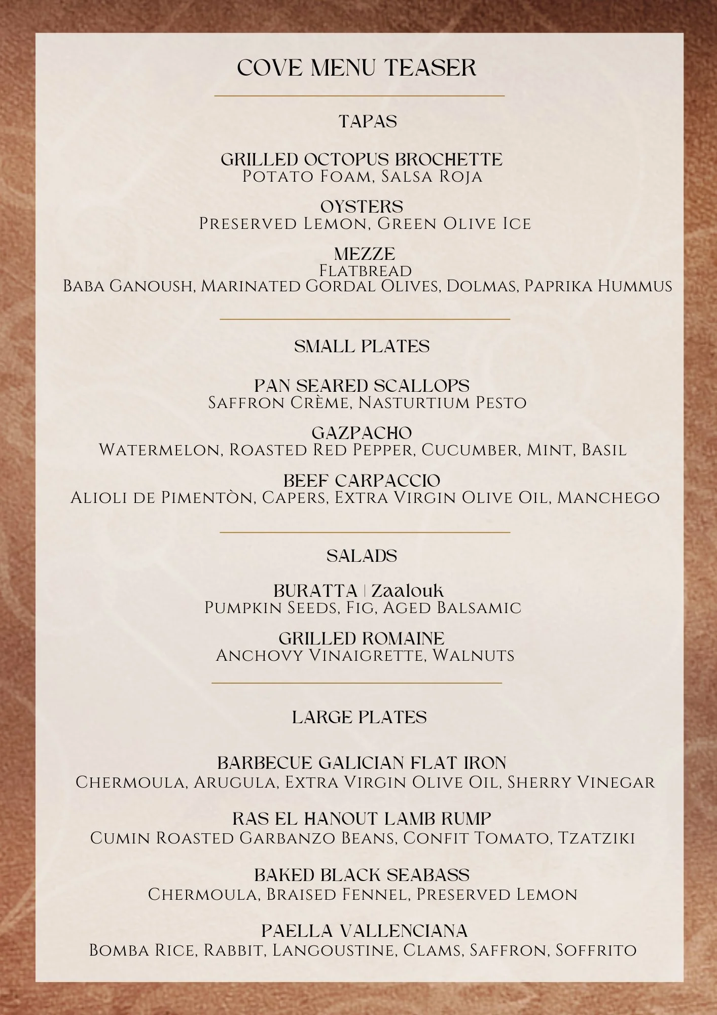 Cove's cuisine is a vibrant blend of Mediterranean and North African flavours, presented with a modern twist. The menu offers tapas, small plates, and larger dishes, highlighting fresh, high-quality ingredients and innovative culinary techniques. Signature dishes include grilled octopus brochette, gazpacho with watermelon, ras el hanout lamb rump, and paella Valenciana, each showcasing the rich and diverse flavours of the region.