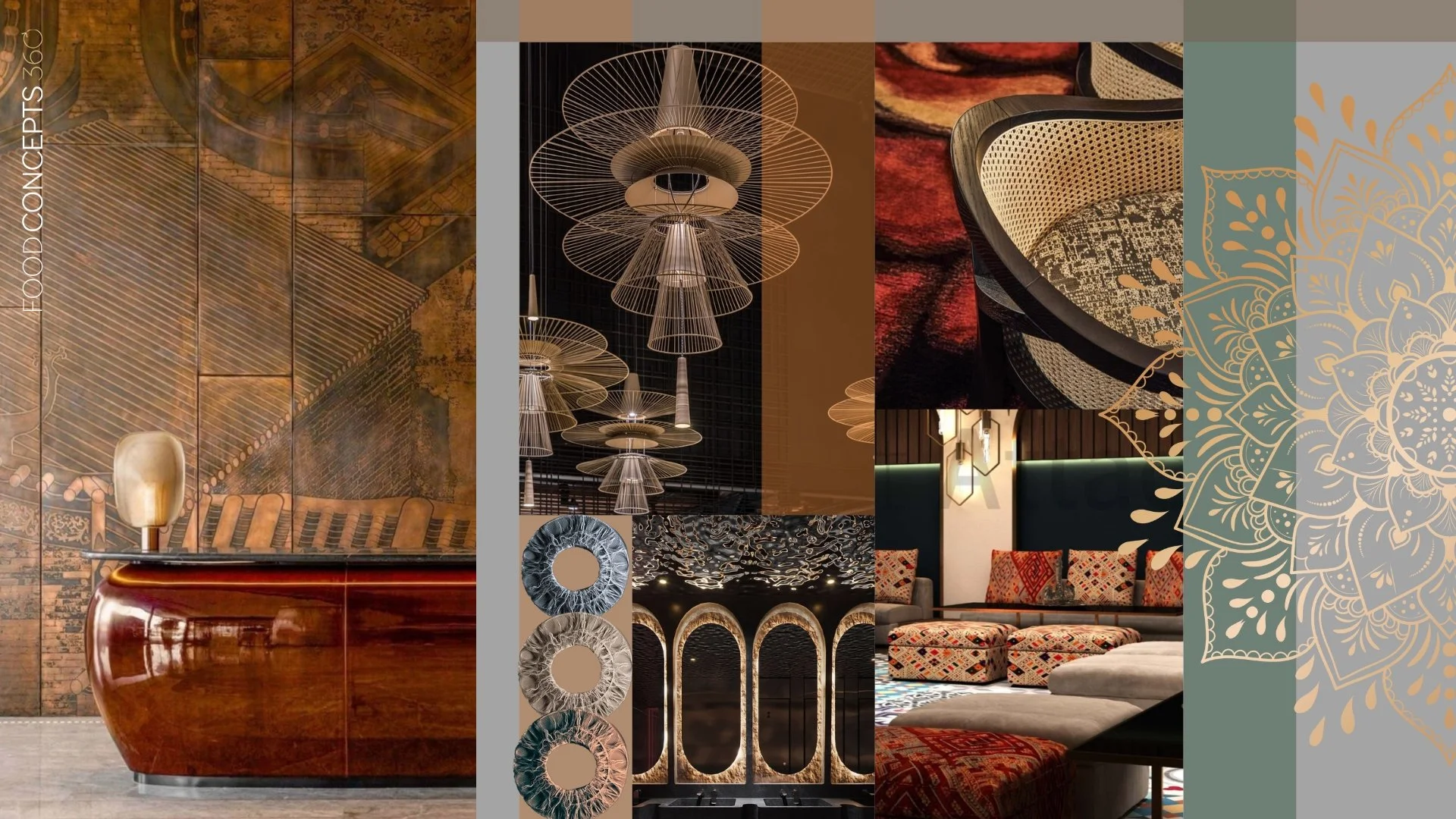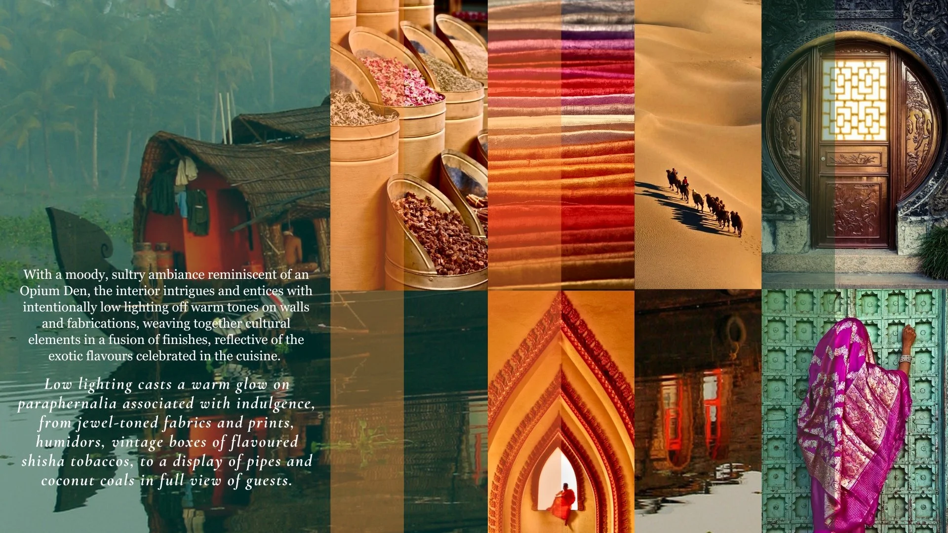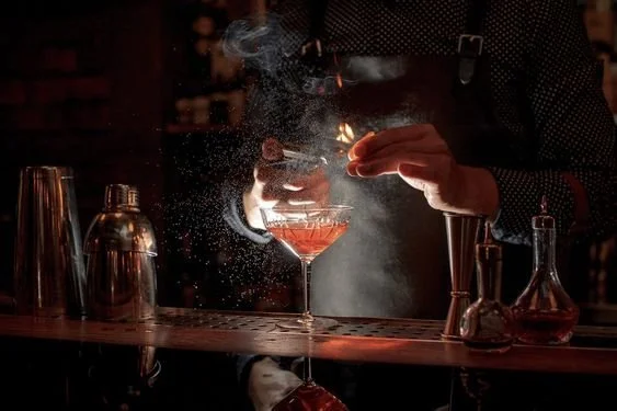 Strategically placed mirrors amplify the lighting and create the illusion of endless depth, adding an enigmatic element to the space's allure. The subtle scent of exotic spices and soft background music enrich the sensory experience, making guests feel like they're embarking on a unique and unforgettable journey. This blend of elements creates a chic, contemporary setting with a cool, cosmopolitan vibe, ideal for those seeking an immersive and elevated dining experience.